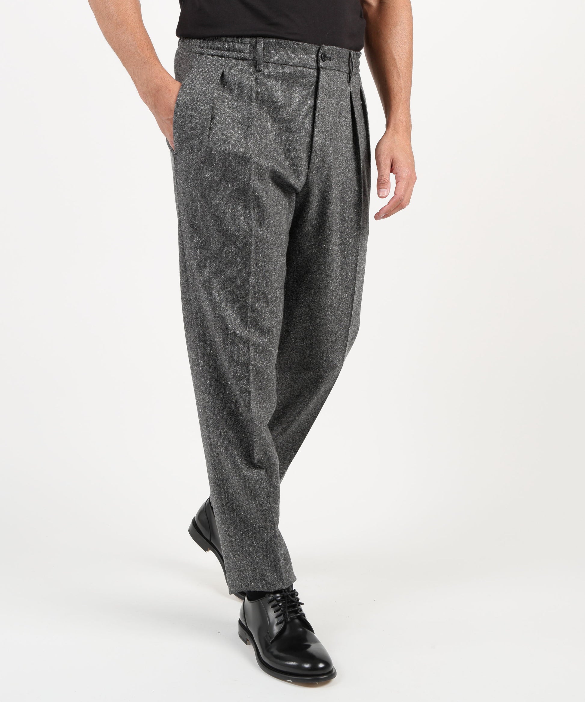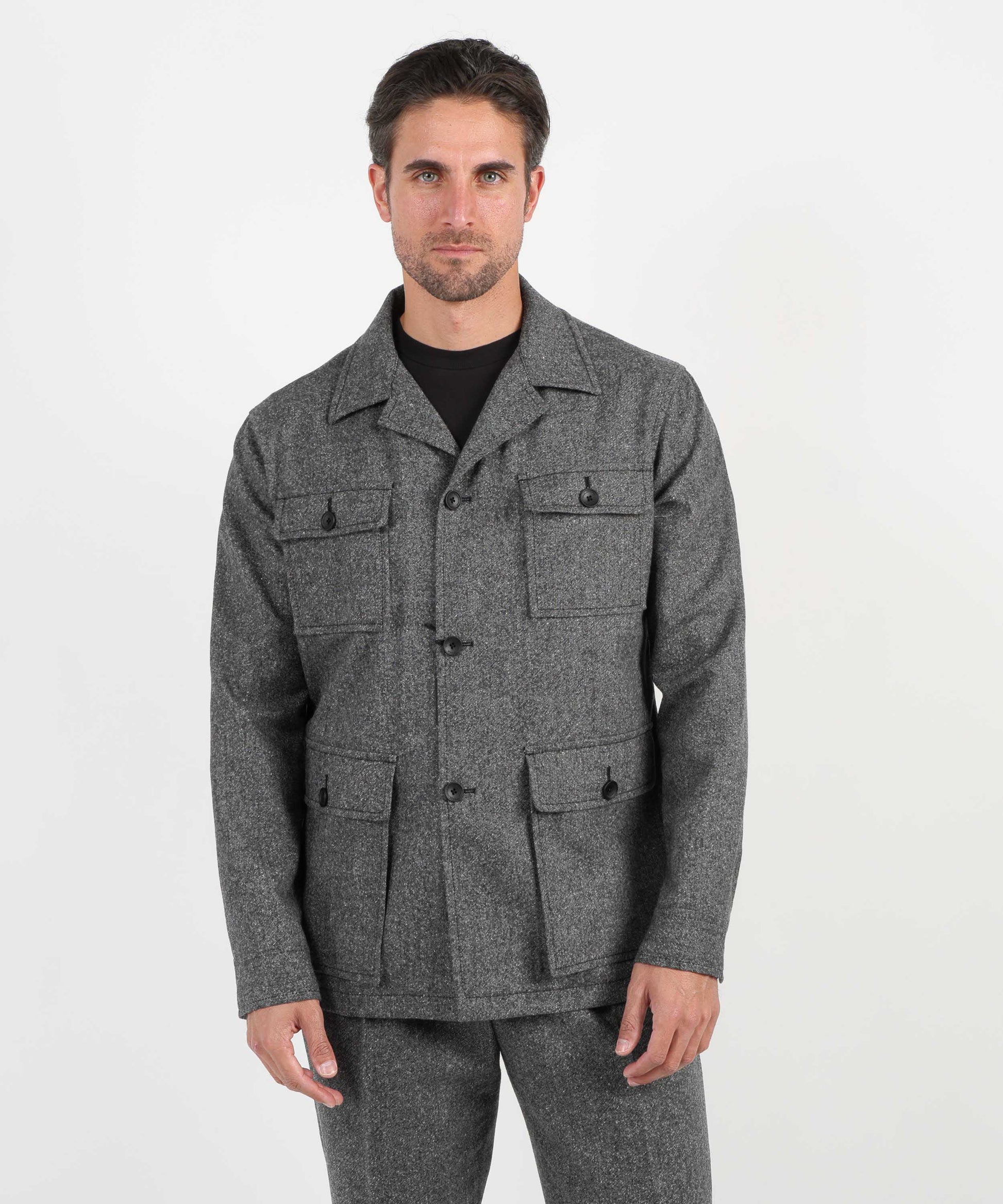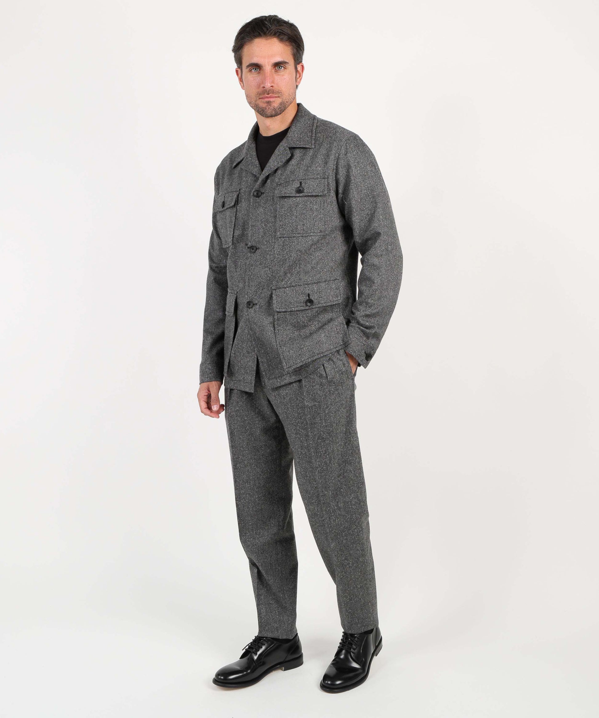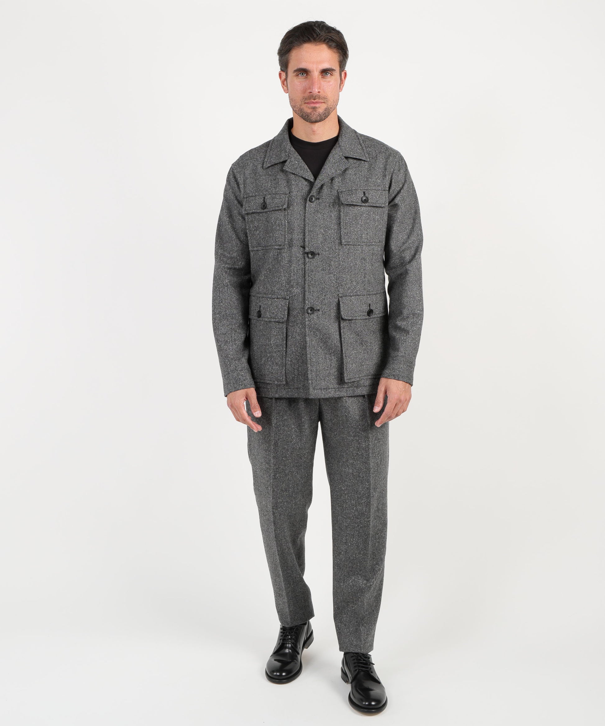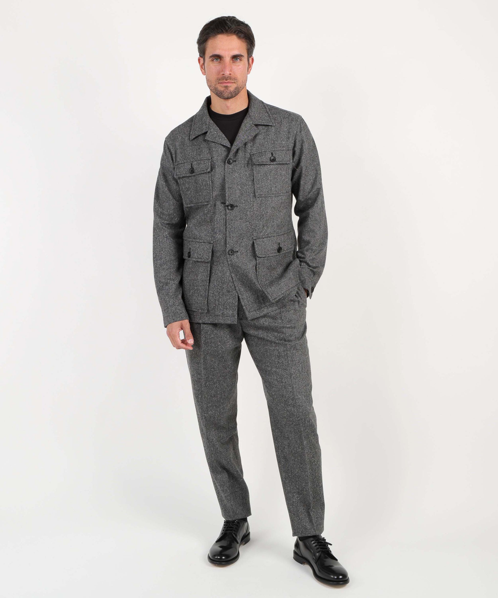 Un completo dallo stile contemporaneo con richiami militari, composto da giacca e pantalone coordinati. La giacca è caratterizzata da 4 tasche a toppa con pattina e bottone, che donano un aspetto deciso e funzionale. Realizzata con materiali di alta qualità, offre comfort e struttura, perfetta per chi desidera distinguersi con un look originale ma elegante. Il pantalone modello “Gor” completa l’outfit con una vestibilità moderna, garantendo libertà di movimento e versatilità d’uso. Ideale per occasioni formali non convenzionali o per look casual chic dal carattere distintivo.