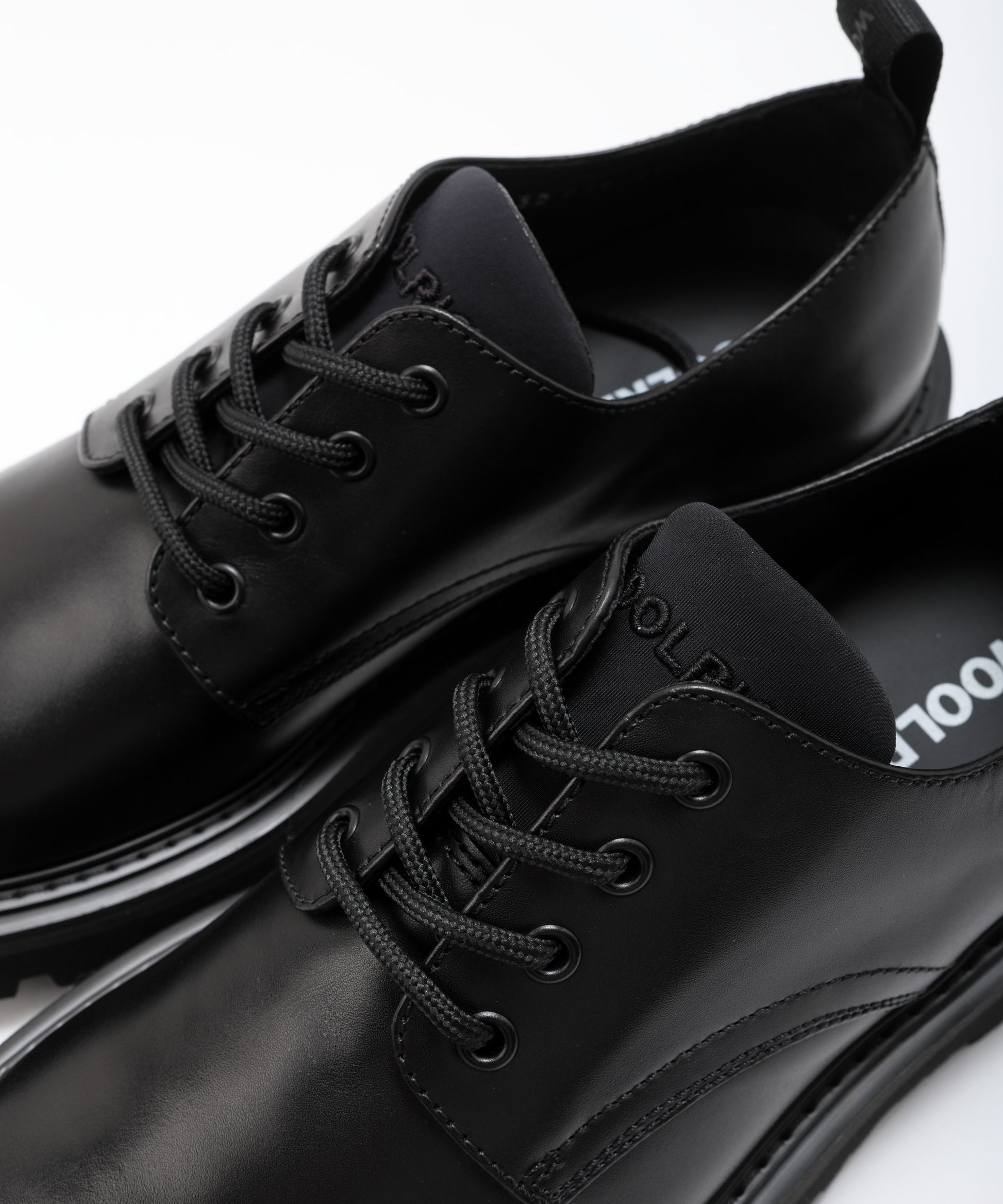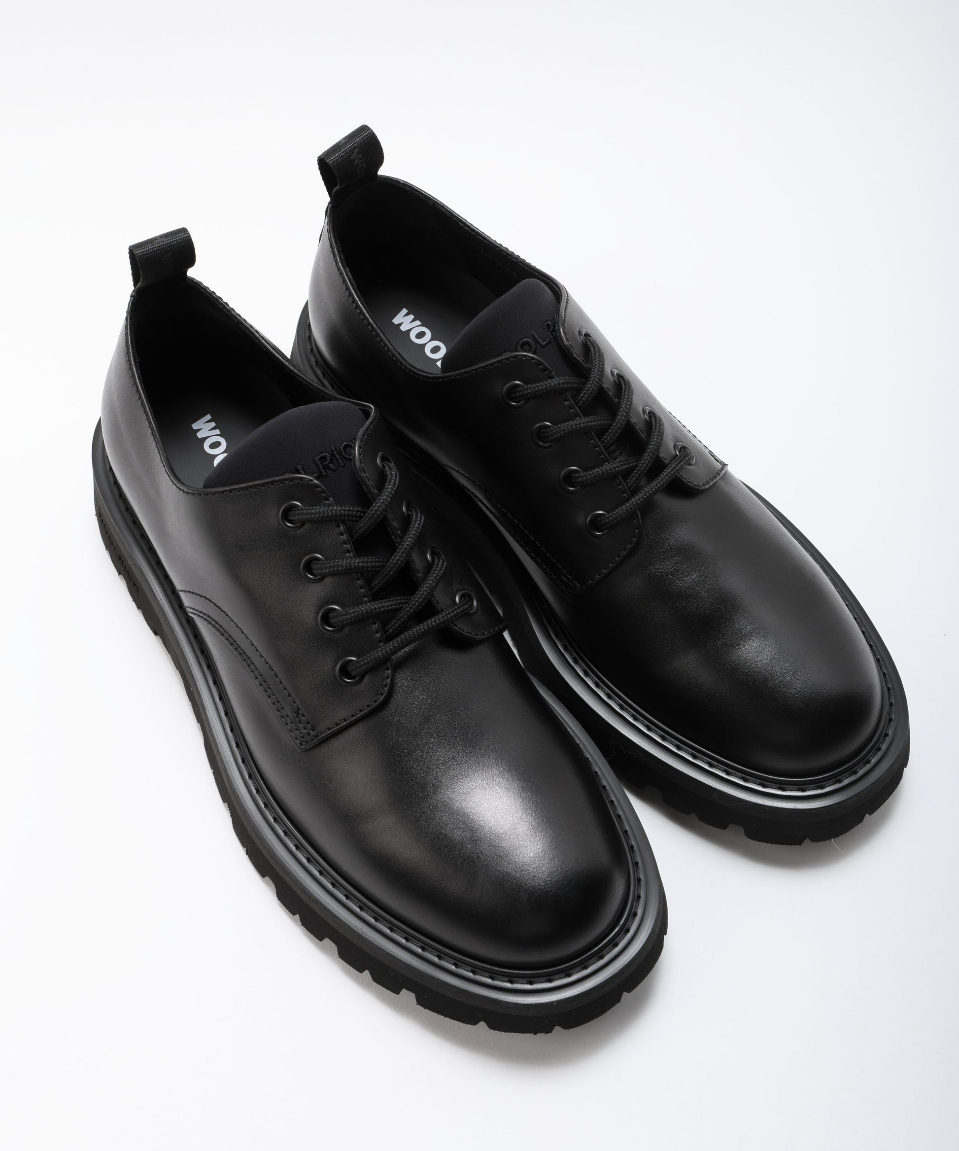 Le Derby Woolrich uniscono eleganza classica e comfort contemporaneo. La tomaia è realizzata in pelle di vitello nera, morbida e resistente, perfetta per garantire uno stile raffinato e duraturo. La linguetta in lycra con scritta Woolrich ricamata e il tirante logato sul retro aggiungono dettagli distintivi e moderni al modello.