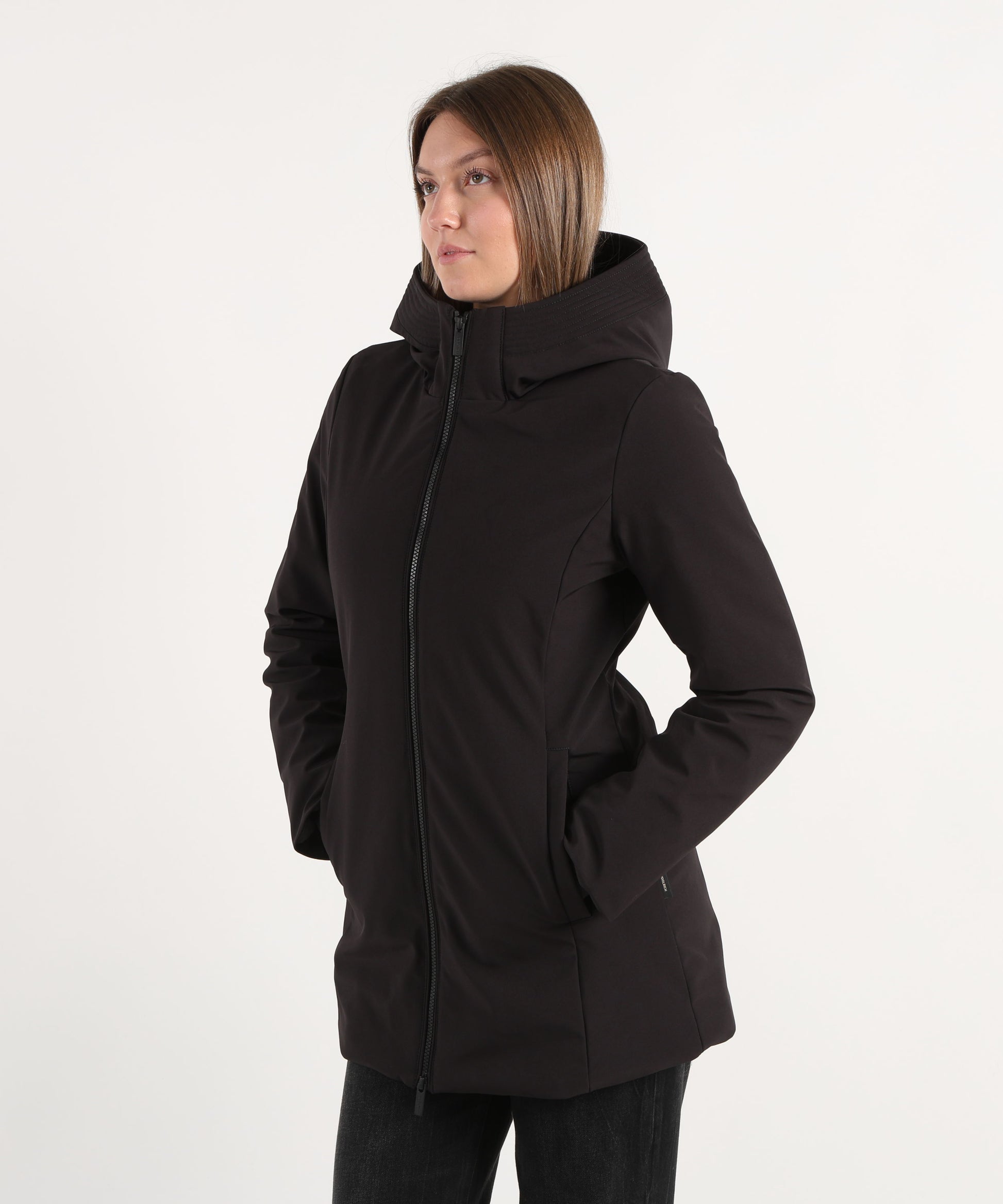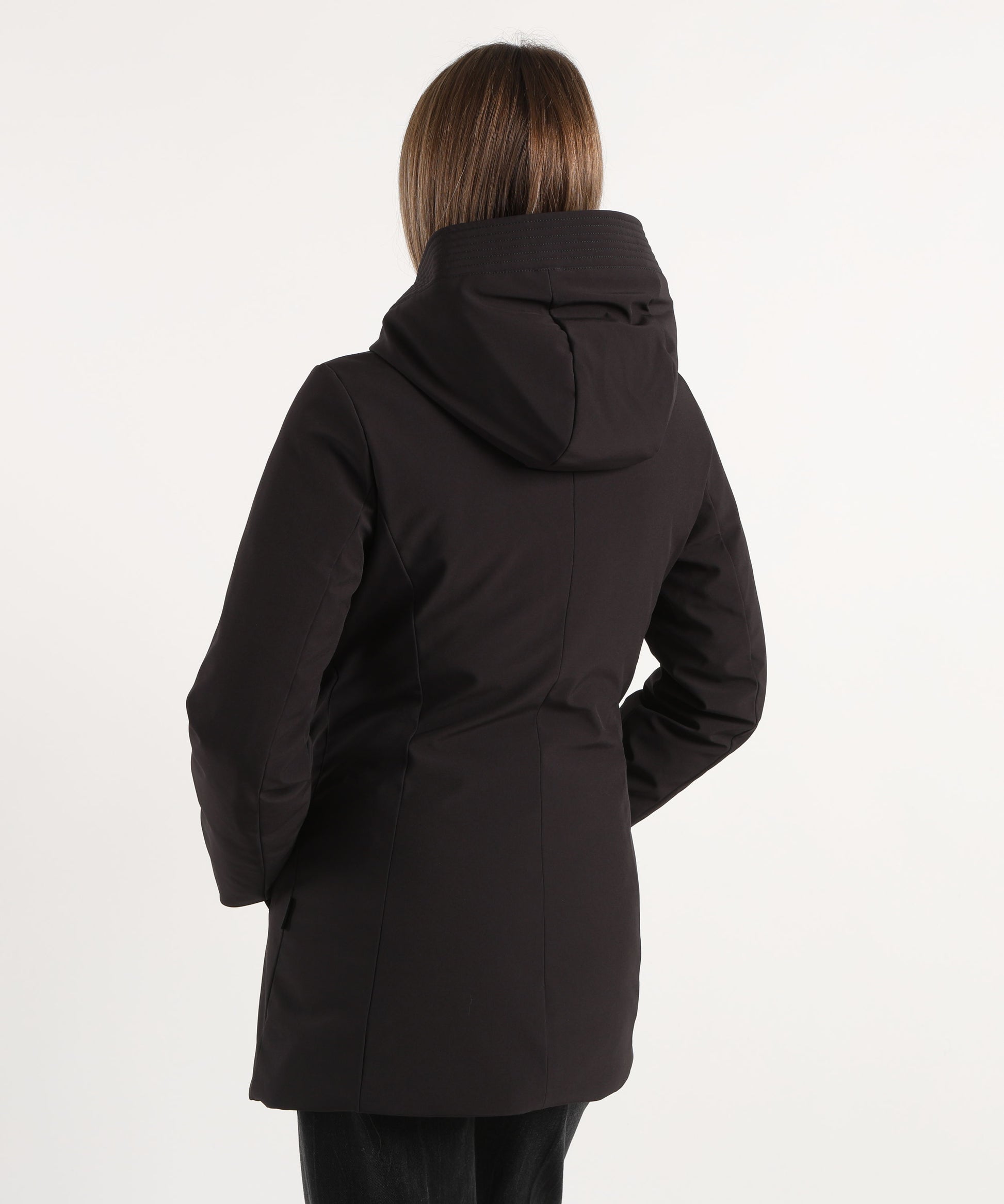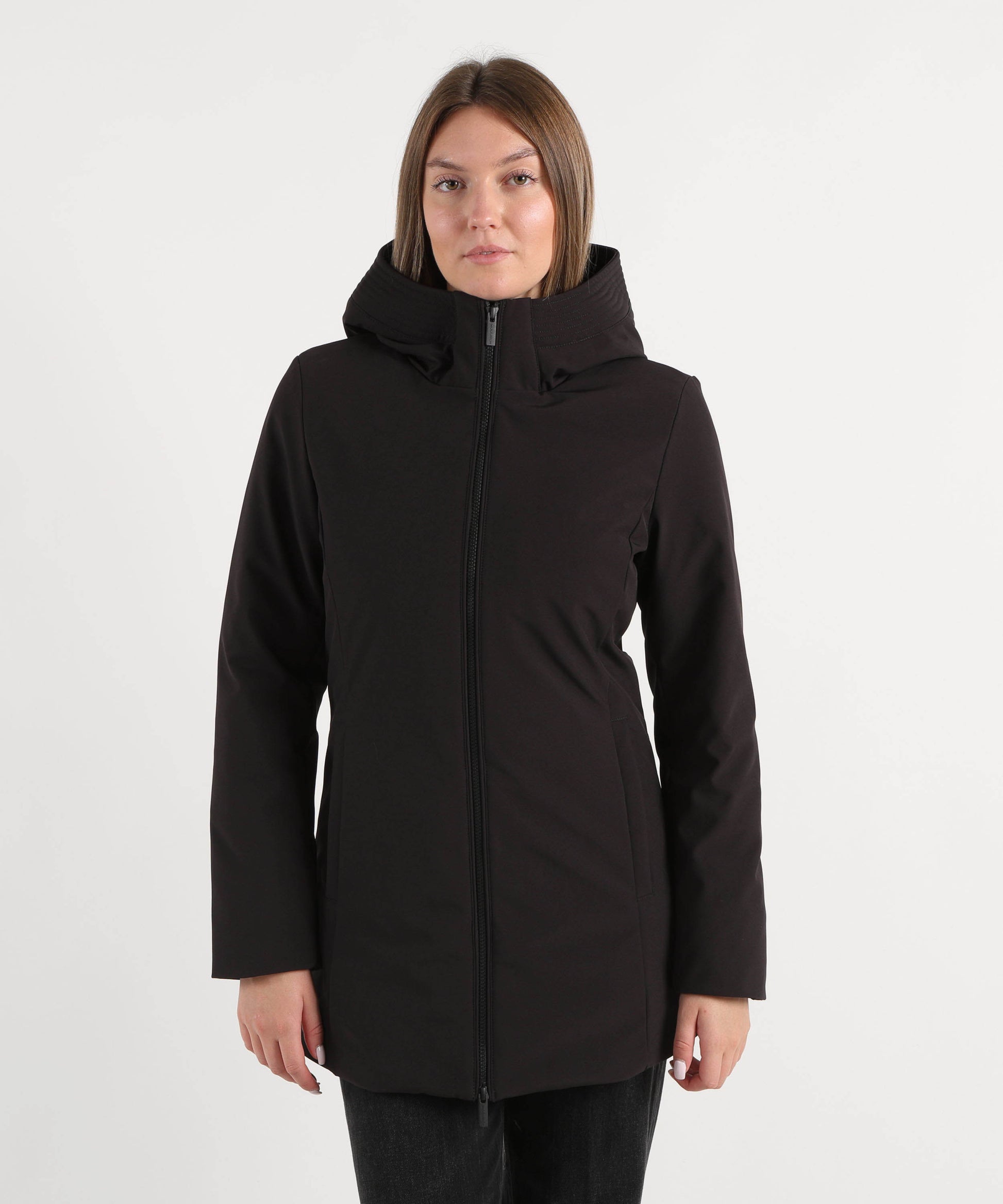 Parka lungo da donna Woolrich in tessuto idrorepellente opaco, con cappuccio, tasche con zip e chiusura frontale. Il logo gommato sulla manica completa un design senza tempo, pratico e raffinato.